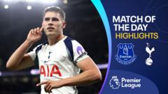 Tottenham inflict Everton’s first defeat at their new Hill Dickinson Stadium as they win 3-0 with two goals from Micky van de Ven and a late header from substitue Pape Matar Sarr.